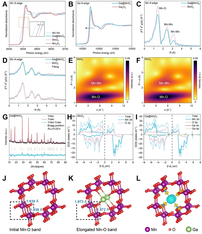 2.Ga掺杂通过三方面优化性能,首先诱导Mn/O空位形成,削弱Zn²⁺与晶格相互作用;其次是膨胀MnO₂隧道结构,拓宽离子传输通道;最后是极化O原子电子云、降低带隙,提升电子导电性与离子扩散速率。
