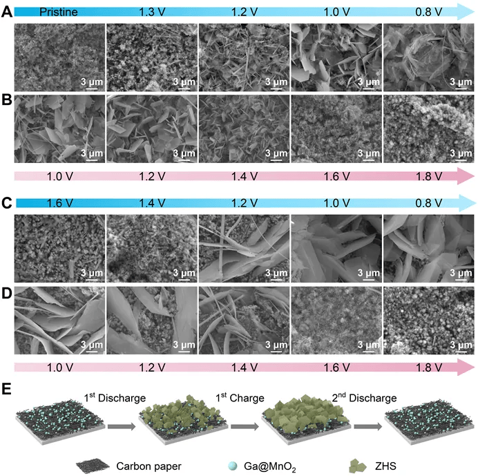图4 Ga@MnO₂正极在前两个循环中的SEM图像。Ga@MnO₂正极首次(A)放电与(B)充电过程。Ga@MnO₂正极第二次(C)放电与(D)充电过程。(E)Ga@MnO₂沉积与ZHS形成过程示意图。