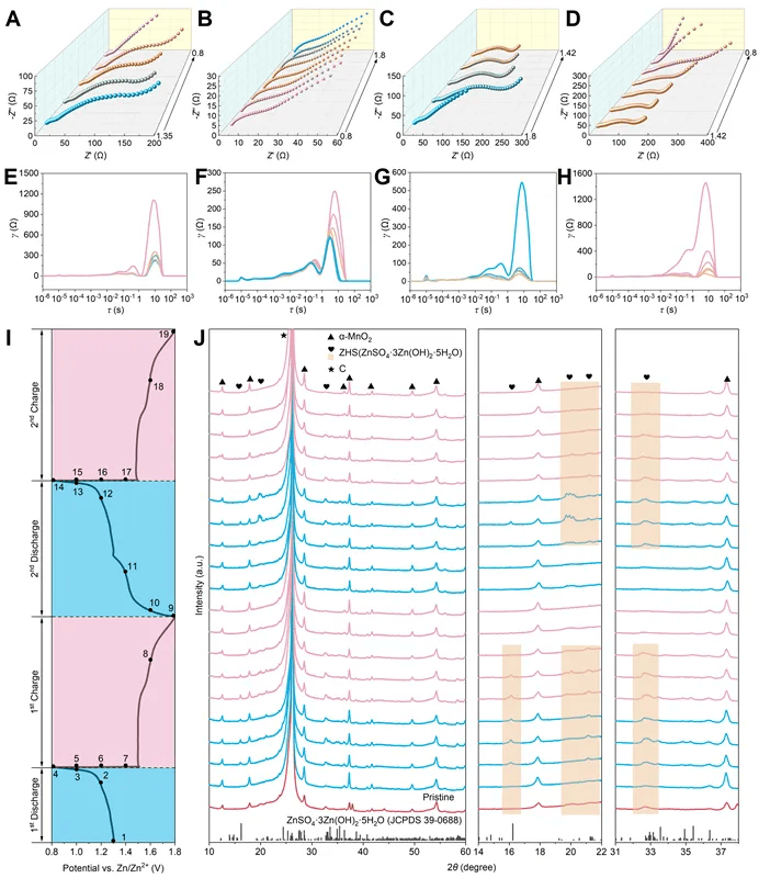4展示了随着电压从1.3 V降至0.8 V,Ga@MnO₂表面逐渐形成纳米片状结构并持续生长,结合EDSmapping(图S13)中Zn、S、O元素的均匀分布,证实该纳米片为反应产物ZHS。这是由于放电过程中H⁺优先嵌入MnO₂结构,导致电极附近局部pH升高,促使电解液中Zn²⁺、SO₄²⁻与OH⁻结合生成ZHS。当电压从1.0 V升至1.8 V时,表面纳米片状ZHS逐渐消失,1.6 V时仅残留少量纳米团簇(可能为未完全分解的ZHS或其分解产物),表明充电过程伴随H⁺从MnO₂中脱出,ZHS发生可逆分解,进一步验证了反应的高可逆性。第二次放电至1.4 V时开始形成ZHS,且纳米片尺寸较首次放电更大;XRD结果显示,此时ZHS的(002)晶面特征峰(16.14°)减弱,(012)晶面特征峰(21.14°)显著增强,这是由于H⁺嵌入更活跃导致pH变化加剧,使ZHS晶体优先取向生长面从(002)转向(012)。整个循环过程中,Ga@MnO₂基体结构无明显破损,证明Ga掺杂有效维持了正极结构稳定性。反应示意图(E)清晰展示了放电时H⁺嵌入→pH升高→ZHS沉积,以及充电时H⁺脱出→ZHS分解的全过程,直观呈现了Ga@MnO₂正极的锌存储反应路径。